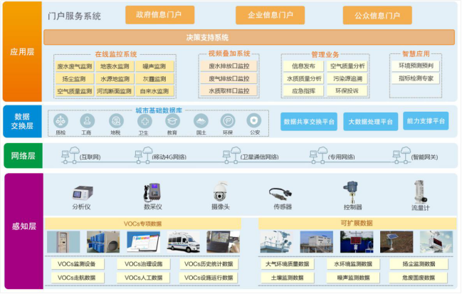 通过环境监测监控子平台建设,构建整个目标范围内的环境质量立体防控体系。通过环境监控、预警、应急的统一规划和建设,基于感知层、网络层、应用层三层架构,所有的在线监测系统与环保数据中心进行连接和信息汇总,建立对水、大气、噪声、污染源、机动车尾气等较为全面的综合监测监控“一体化”平台,并通过“环保一张图”展示目标范围内所有的数据监测情况。