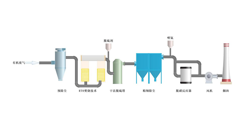 含氮源的挥发性有机废气(简称VOCs)在直接燃烧或蓄热式燃烧(或催化燃烧)的过程中会形成一定浓度的氮氧化物(NOx)/二氧化硫(SO2)/氯化氢(HCl),再通过干法脱酸和选择性催化还原(简称SCR)法治理,最终实现有机废气和氮氧化物的协同超低排放。