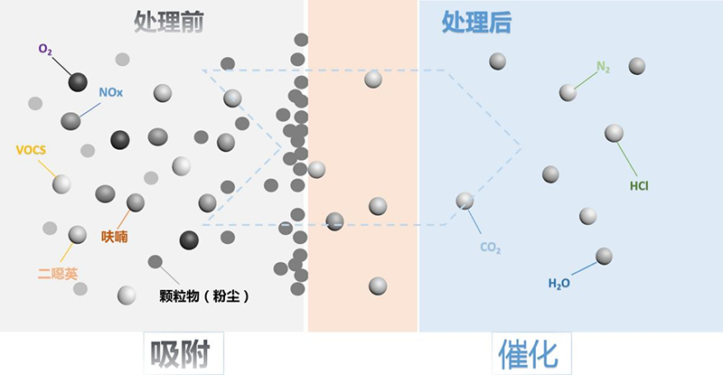 大气多污染物综合治理是指将废气中的VOCs、NOx、SO2、HCl、O3、重金属和二噁英等有害气体,通过吸附或催化技术来协同脱除。