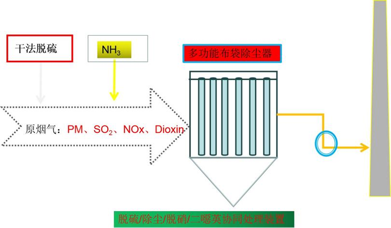 采用新型滤袋催化(氧化/还原)技术将烟气(脱酸后)中的多种污染物(NOx、VOCs、CO、二噁英等)在除尘系统里协同高效脱除。